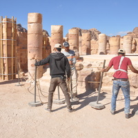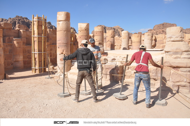 - Jordan. Petra, Temple of the Winged Lions, team members placing rope barriers in front of temple podium