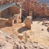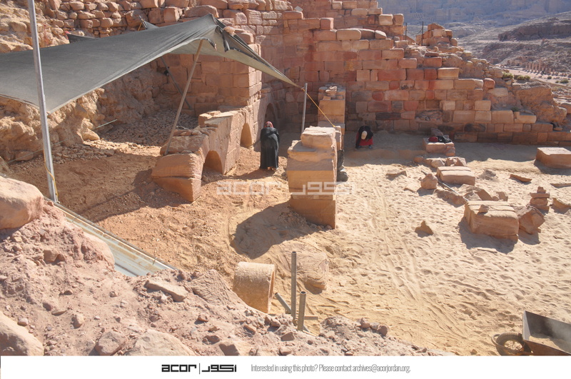 - Jordan. Petra, Temple of the Winged Lions, chute, workers backfilling the southwest quadrant to help protect the rubble slope in the back from collapsing and from rainfall runoff