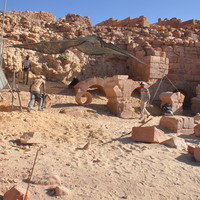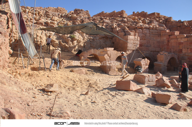 - Jordan. Petra, Temple of the Winged Lions, chute, workers backfilling the southwest quadrant to help protect the rubble slope in the back from collapsing and from rainfall runoff