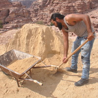 - Jordan. Petra, Temple of the Winged Lions, team member shoveling sand into a wheelbarrow for backfilling of southwest quadrant