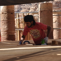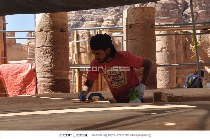 - Jordan. Petra, Temple of the Winged Lions, Hamza Wakyan applies final layer of mortar over cella podium