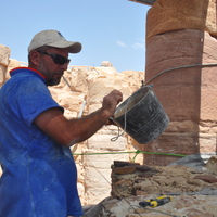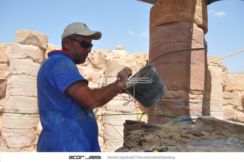 - Jordan. Petra, Temple of the Winged Lions, Baha‘ Jankhot applying first layer of mortar over geotextile fabric on cella podium