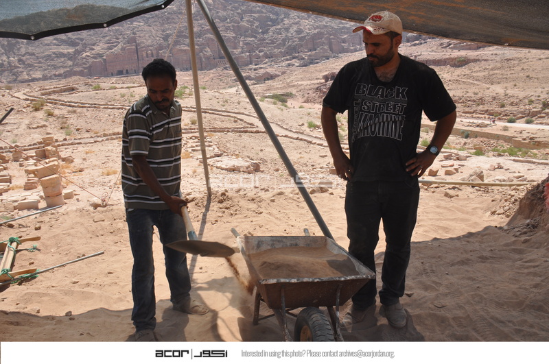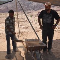 - Jordan. Petra, Temple of the Winged Lions, Bassam Alfaqeer and team member shoveling soil to then be sifted for backfilling in the southeast quadrant