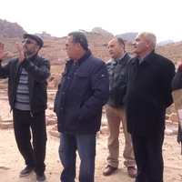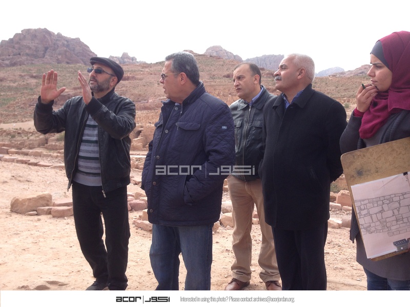 - Jordan. Petra, Temple of the Winged Lions, from left: Jehad Haron, Director General of Dept. of Antiquities Dr. Monther Jamhawi, Ghassan Al Deir, Halemah al Nawafleh, looking up at temple