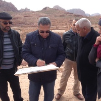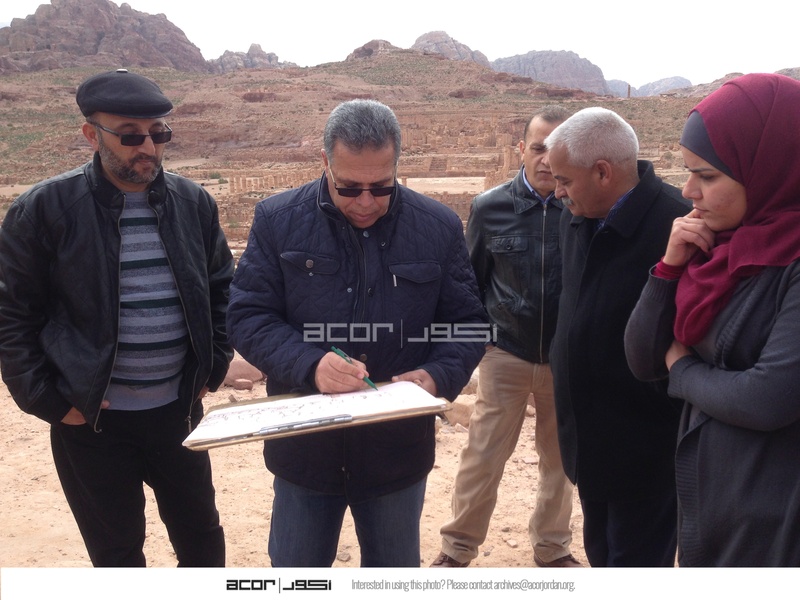 - Jordan. Petra, Temple of the Winged Lions, from left: Jehad Haron, Ghassan Al Deir, Mohammad Shobaki, Halemah al Nawafleh, Director General of Dept. of Antiquities Dr. Monther Jamhawi with drawing board
