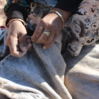 - Jordan. Petra, Temple of the Winged Lions, team member sewing sandbags