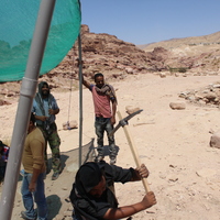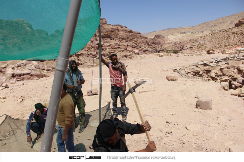 - Jordan. Petra, Temple of the Winged Lions, TWL team member using pickaxe to dislodge spoil heap for sifting