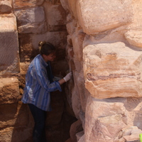 - Jordan. Petra, Temple of the Winged Lions, team members mortaring wall in southwest quadrant