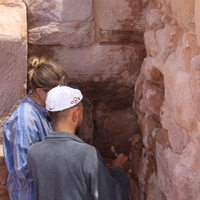 - Jordan. Petra, Temple of the Winged Lions, team members mortaring wall in southwest quadrant