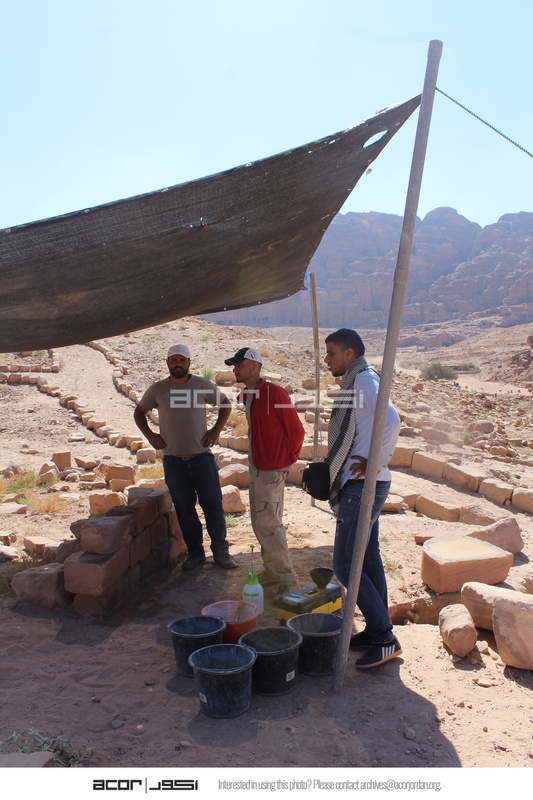 - Jordan. Petra, Temple of the Winged Lions, Ahmad Mowasa (in red) and other team members under shade with conservation materials
