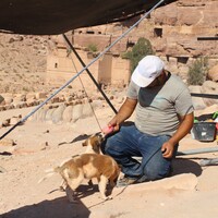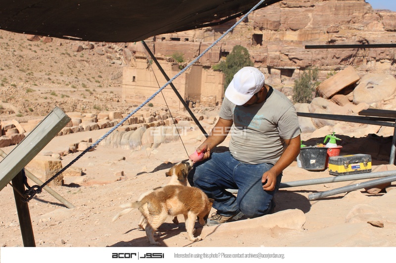 - Jordan. Petra, Temple of the Winged Lions, local worker with dogs