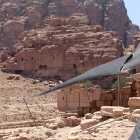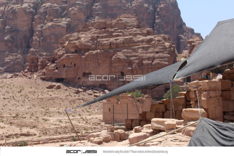 - Jordan. Petra, Temple of the Winged Lions, southest quadrant, looking southwest with shade over pronaos and Qasr al Bint in background