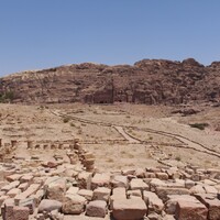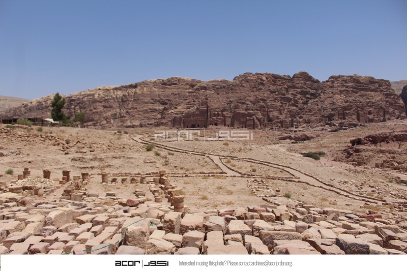 - Jordan. Petra, Temple of the Winged Lions, lapidarium (architectural stone gallery) in foreground, Royal Tombs in background