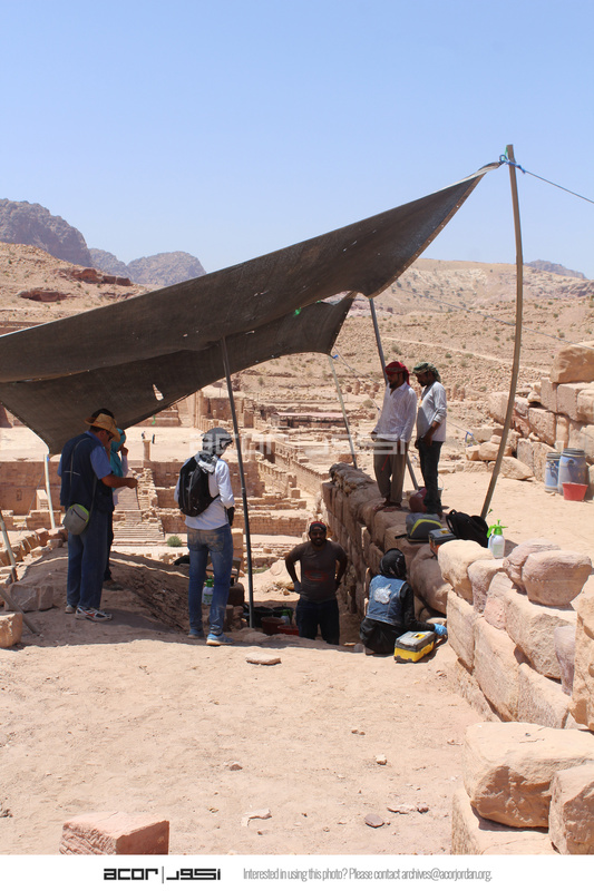 - Jordan. Petra, Temple of the Winged Lions, shade used for documentation work, pictured: Franco Sciorilli and team members