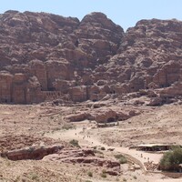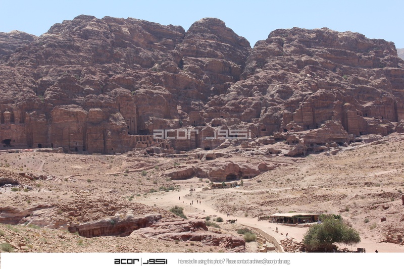 - Jordan. Petra, Temple of the Winged Lions, view from the temple to Royal Tombs, with pathway and Nymphaeum spring
