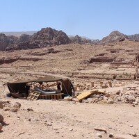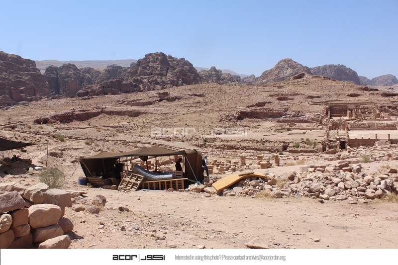 - Jordan. Petra, Temple of the Winged Lions, facing south towards Great Temple with path, project tent, Great Temple in background, lapidarium