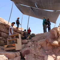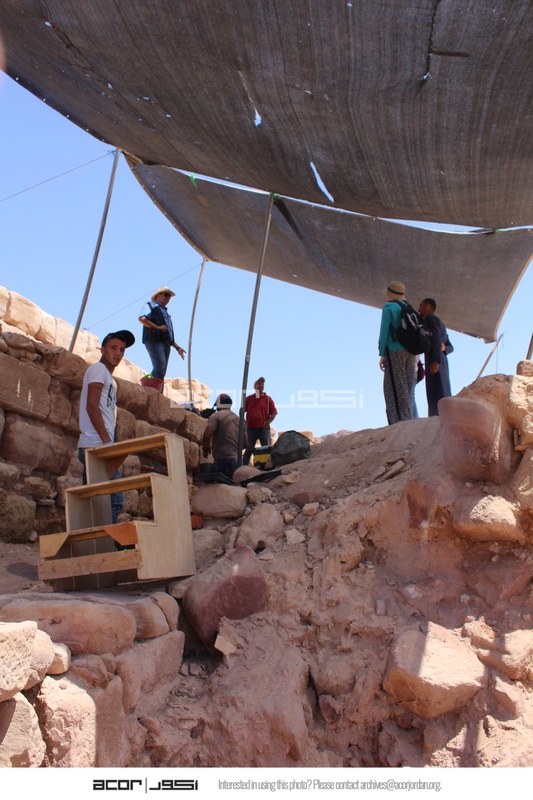 - Jordan. Petra, Temple of the Winged Lions, team members under shade