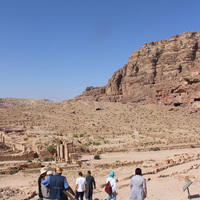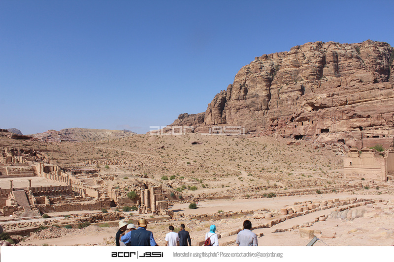 - Jordan. Petra, Temple of the Winged Lions, view of Great Temple to left, with Qasr al Bint and Umm al Biyara to the right, team members