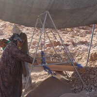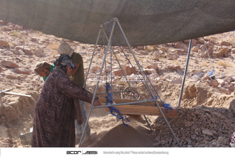 - Jordan. Petra, Temple of the Winged Lions, local team members sifting sand to fill sandbags which are used in conservation