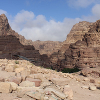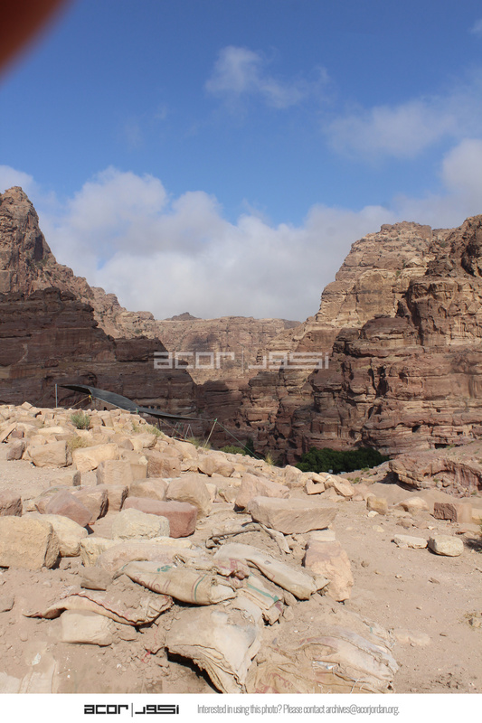- Jordan. Petra, Temple of the Winged Lions, sandbags, sifting area in tent, north side of site looking west