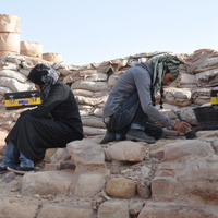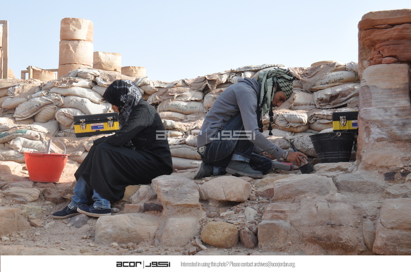 - Jordan. Petra, Temple of the Winged Lions, staff cleaning debris from between the stones before they add mortar
