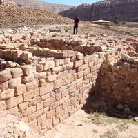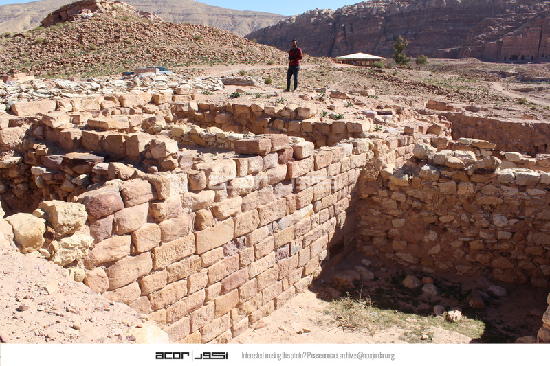 - Jordan. Petra, Temple of the Winged Lions, room in northern complex, shelter of Petra Church (white shelter) in background, facing east, with visitor