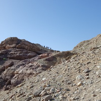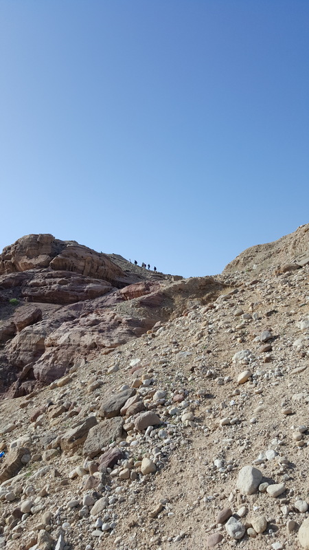 Jordan. Ghawr as Safi, climbing the Nabataean citadel of Umm Tawabin above the south bank of Wadi al-Hasa in the Ghawr as Safi with the US Ambassador Alice Wells