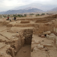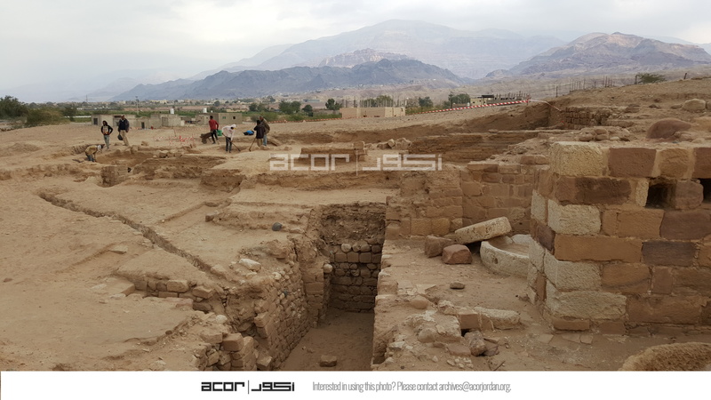 Jordan. Ghawr as Safi, lower area in front (north) of the sugar presses. Sugar juice conduit on the right of photo, leading to the sugar processing (boiling and curing) area in the background at sugar factory (Masna’ as-Sukkar), SCHEP team in distance