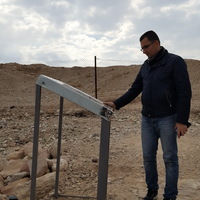Jordan. Ghawr as Safi, Nizar Al Adarbeh in front of newly installed SCHEP panel at sugar factory (Masna’ as-Sukkar)