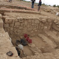 Jordan. Ghawr as Safi, excavations at Khirbet Sheik Isa. Dr. Alexandra Arriotti excavates Abbasid period remains in trench
