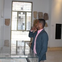 Jordan. Ghawr as Safi, Museum at the Lowest Place on Earth (MuLPE), site steward Nayef Shamalat in front of glass display unit