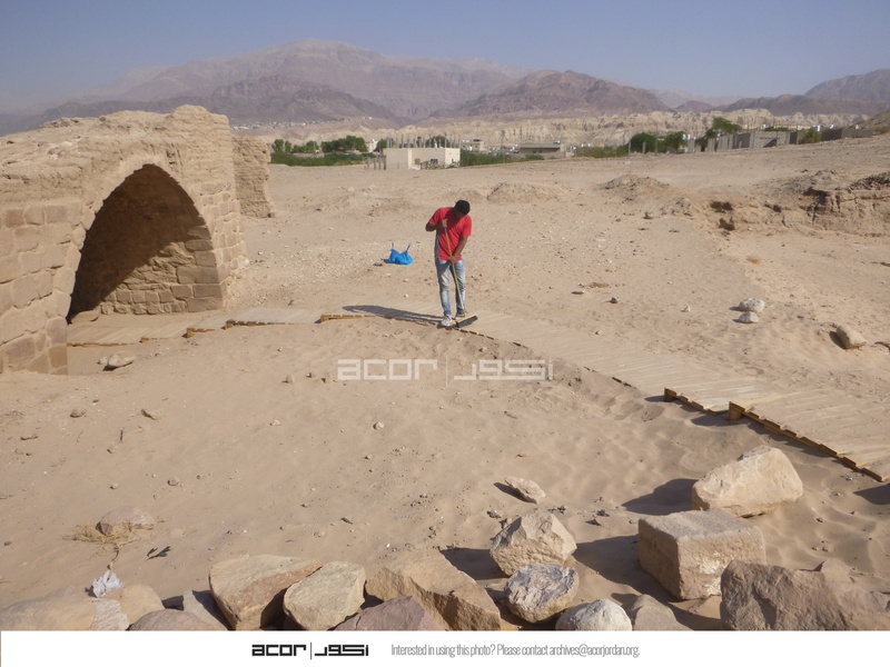Jordan. Ghawr as Safi, walkway and water conduit at sugar factory (Masna’ as-Sukkar) archaeological site, worker cleaning walkway