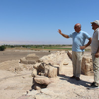 Jordan. Ghawr as Safi, Konstantinos Politis with Jehad Haron at sugar factory (Masna’ as-Sukkar) archaeological site