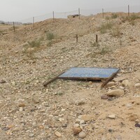 Jordan. Ghawr as Safi, damaged sign at sugar factory (Masna’ as-Sukkar) archaeological site