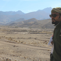 Jordan. Wadi Araba, Bir Madhkur, Site Steward Mohammad Saedeen walking on ad-Dlayi path, ancient incense route, toward Qasr Umm Rattam