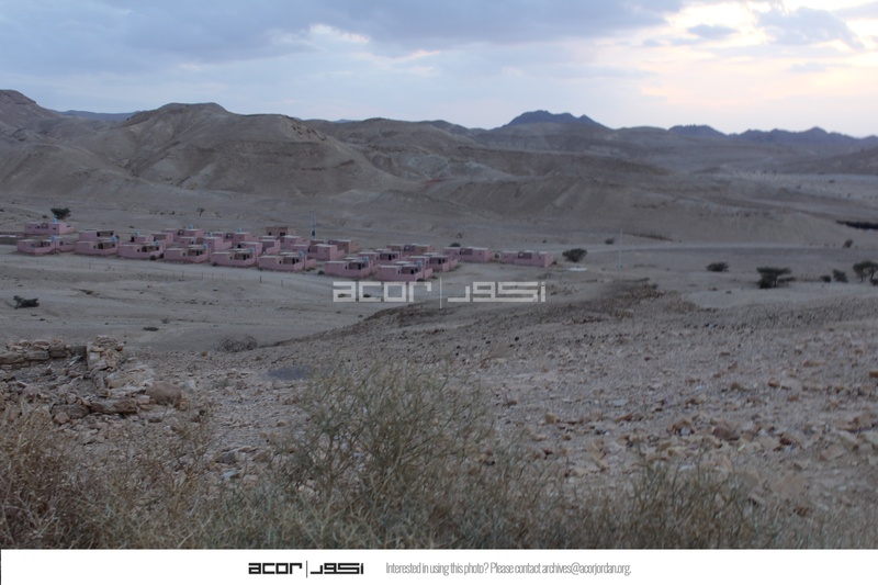 Jordan. Wadi Araba, Bir Madhkur, general view of tourist cabins from police station, Samra at Taybeh Mountain in the background