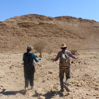 Jordan. Wadi Araba, Bir Madhkur, Site Steward Mohammad Saedeen and Maria Trogolo of USAID SCHEP under a seyal tree, taking a break from walking on ad-Dlayi path