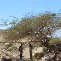 Jordan. Wadi Araba, Bir Madhkur, Site Steward Mohammad Saedeen and Maria Trogolo of USAID SCHEP under a seyal tree, taking a break from walking on ad-Dlayi path