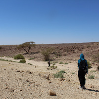 Jordan. Wadi Araba, Bir Madhkur, Maria Trogolo of USAID SCHEP walking on ad-Dlayi path, ancient incense route
