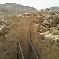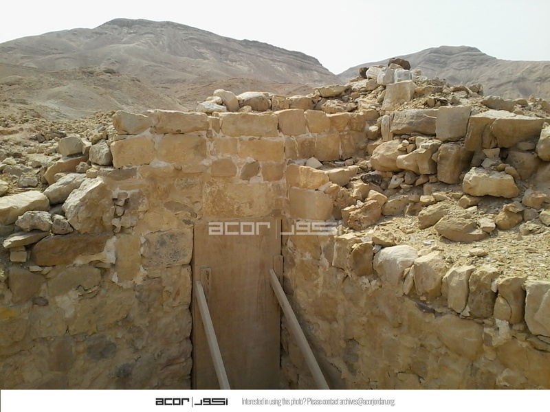 Jordan. Wadi Araba, Bir Madhkur, remains of rooms at Khirbat Bir Madhkur, wooden door and trusses added later to support the wall