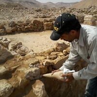 Jordan. Wadi Araba, Bir Madhkur, Naif Zaban of ACOR works on restoration of a wall in the northwest part of Khirbat Bir Madhkur