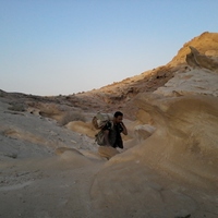 Jordan. Wadi Araba, Bir Madhkur, Site Steward Mohammad Saedeen walking on ad-Dlayi path