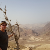 Jordan. Wadi Araba, Bir Madhkur, Barbara Porter from ACOR next to juniper tree, ad-Dlayi path on the ancient incense route