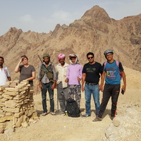 Jordan. Wadi Araba, Bir Madhkur, USAID SCHEP team members and local workers in front of cairn on the ad-Dlayi path