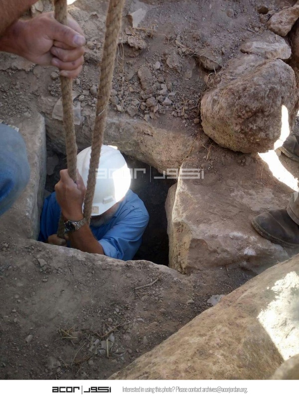 Jordan. Madaba, Madaba Archaeological Park West, MRAMP project Co-director Douglas Clark enters one of the site’s 6th-century Byzantine cisterns