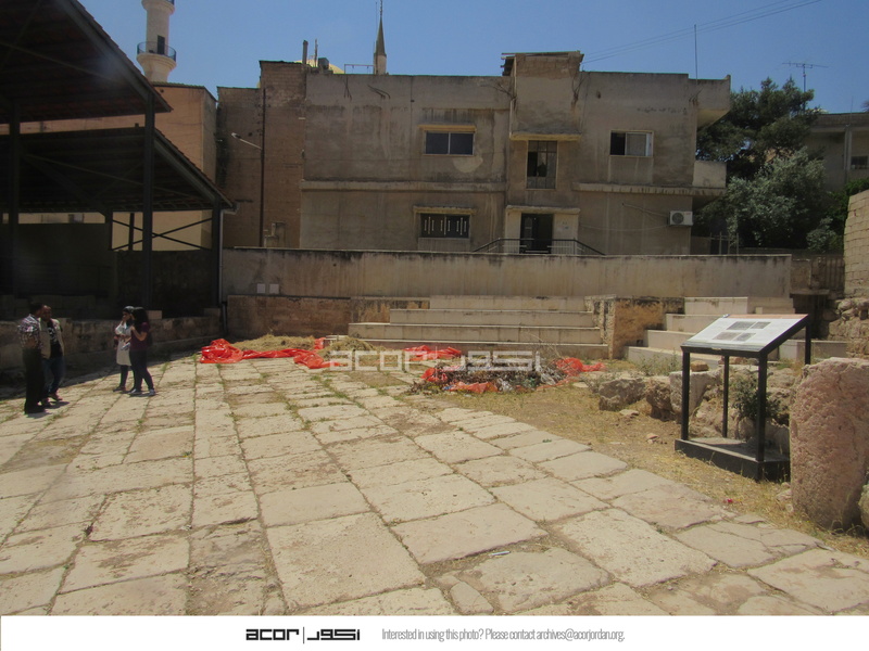 Jordan. Madaba, Madaba Archaeological Park West, 2nd-century paved Roman plaza with 6th-century Byzantine Martyrs Church to the left, modern building in the middle, and interpretive sign on the right, looking south