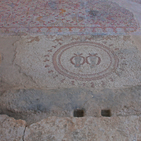 Jordan. Madaba, Madaba Archaeological Park West, welcoming sandals medalion embedded at the entrance to the east wing of the 6th-century Byzantine Burnt Palace, showing the entry threshold and door stops