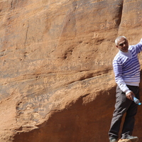 Jordan. Wadi Rum, Professor Ibrahim Sadaqa explaining rock art and Thamudic inscriptions to school children