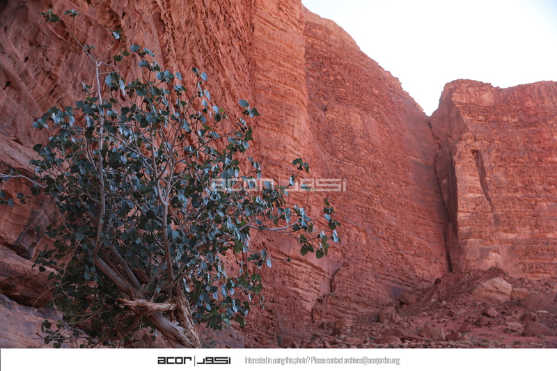 Jordan. Wadi Rum, Al Khazali mountain, cliff face, tree