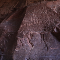 Jordan. Wadi Rum, Khazali canyon, rock art, Thamudic and Arabic inscriptions